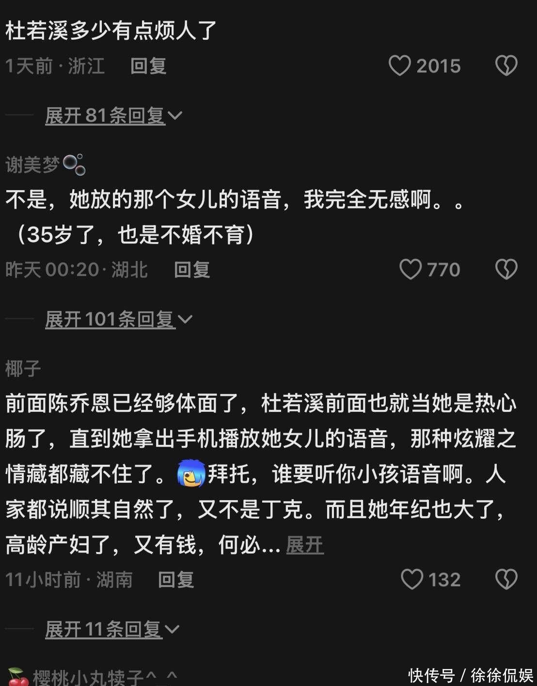 更让人膈应的是,杜若溪这种行为,可能本意是好的,但真的让人心里很不舒服。你看她反复强调 “我女儿每天跟我撒娇”,语气里的得意都快溢出来了,好像在说 “你看我有这么可爱的娃,你没有,多可惜”。